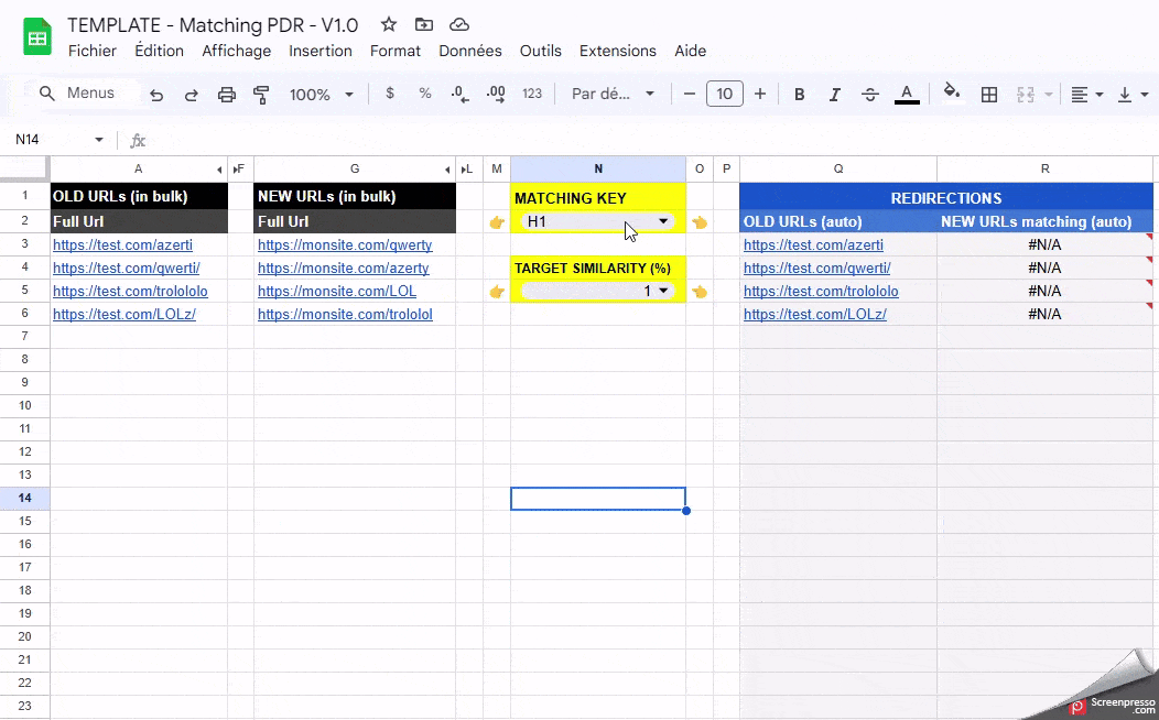 Ce Google Sheet t’aide à générer automatiquement tes redirections 301 à partir de tes anciennes et nouvelles URLs.